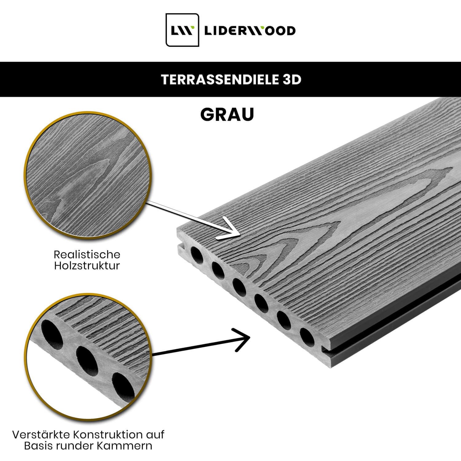 Die 3D-Diele verbindet elegantes Design mit einem praktischen Ansatz für die Terrassengestaltung. Dank der beidseitigen Ausführung können Sie die Optik an Ihre Vorlieben anpassen – je nachdem, ob Sie die natürliche Prägung oder die dezente Riffelung wählen. Die verstärkte Konstruktion und der hochwertige Verbundwerkstoff sorgen dafür, dass die Diele beständig gegen Feuchtigkeit, Fäulnis, UV-Strahlung und Insekten ist.