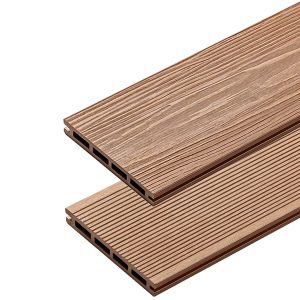 Dwustronna deska tarasowa oferuje piękno naturalnych odcieni: dębu i orzecha. Deski Premium można układać obustronnie – drugi kolor pozostanie niewidoczny. Podobnie jak pozostałe deski Premium i deski Solid, naturalny wygląd nadaje jej także charakterystyczny wzór drewna. Mają również nałożoną ze wszystkich stron powłokę polimerową, która chroni je przed plamami, utratą koloru i ścieraniem.