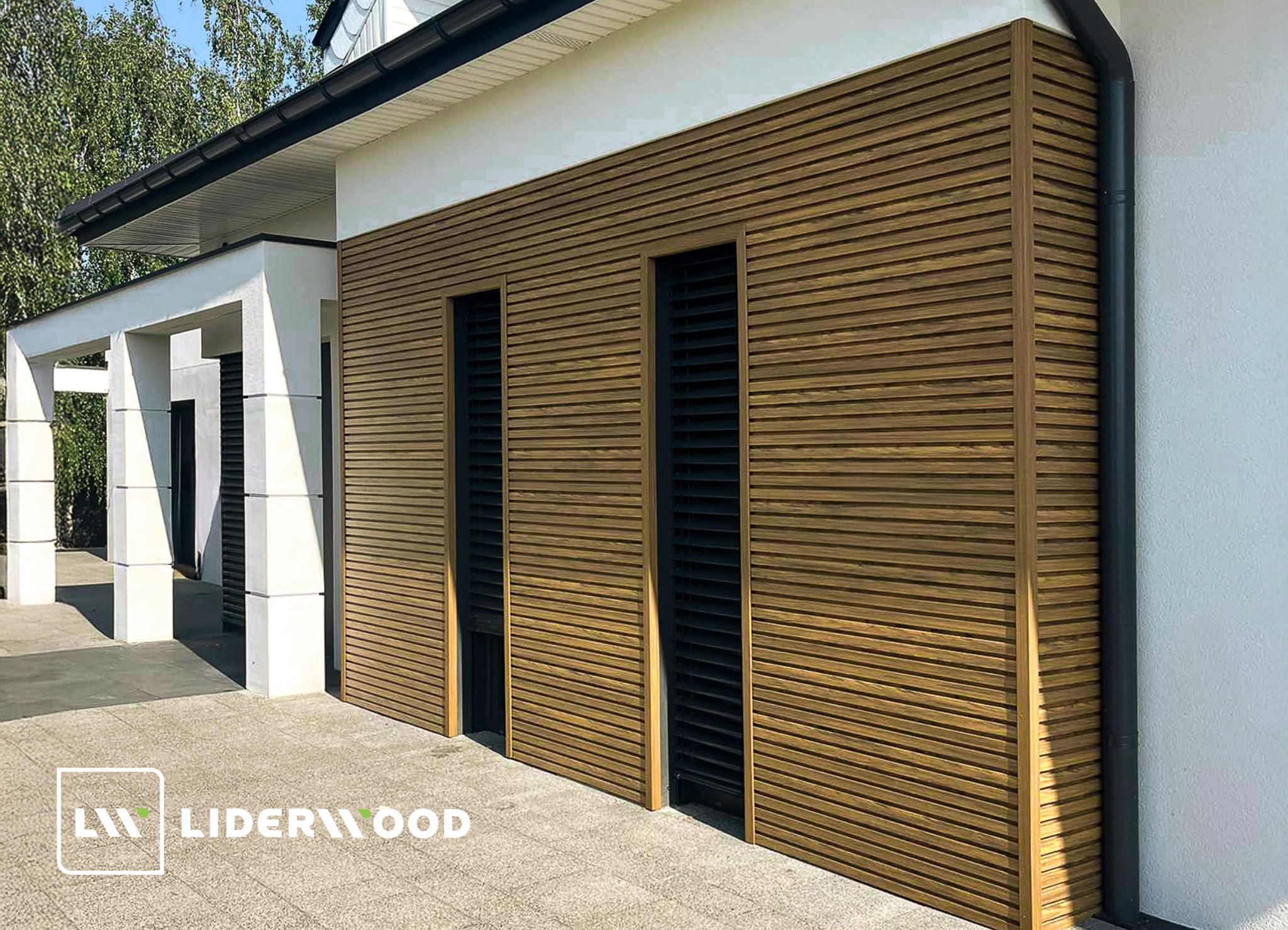 Diese Lamellenfarbe wurde für diejenigen entwickelt, die Natürlichkeit mit Eleganz verbinden möchten. Lamellen im edlen Golden‑Oak‑Ton kontrastieren eindrucksvoll mit dem tiefen Schwarz zwischen ihnen und schaffen so eine stilvolle, moderne Fassadenwirkung.