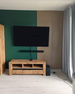 Die Leisten sind ca. 30 mm breit und 17 mm dick. Modelle mit integrierter Trägerplatte erreichen eine Gesamtpaneelbreite von bis zu 168 mm – das ermöglicht ein schnelleres Abdecken größerer Flächen. Dekorative Lamellen werden mit gleichmäßigen Abständen montiert, was einen geometrischen Rhythmus erzeugt und dem Raum Eleganz, Struktur und Modernität verleiht.