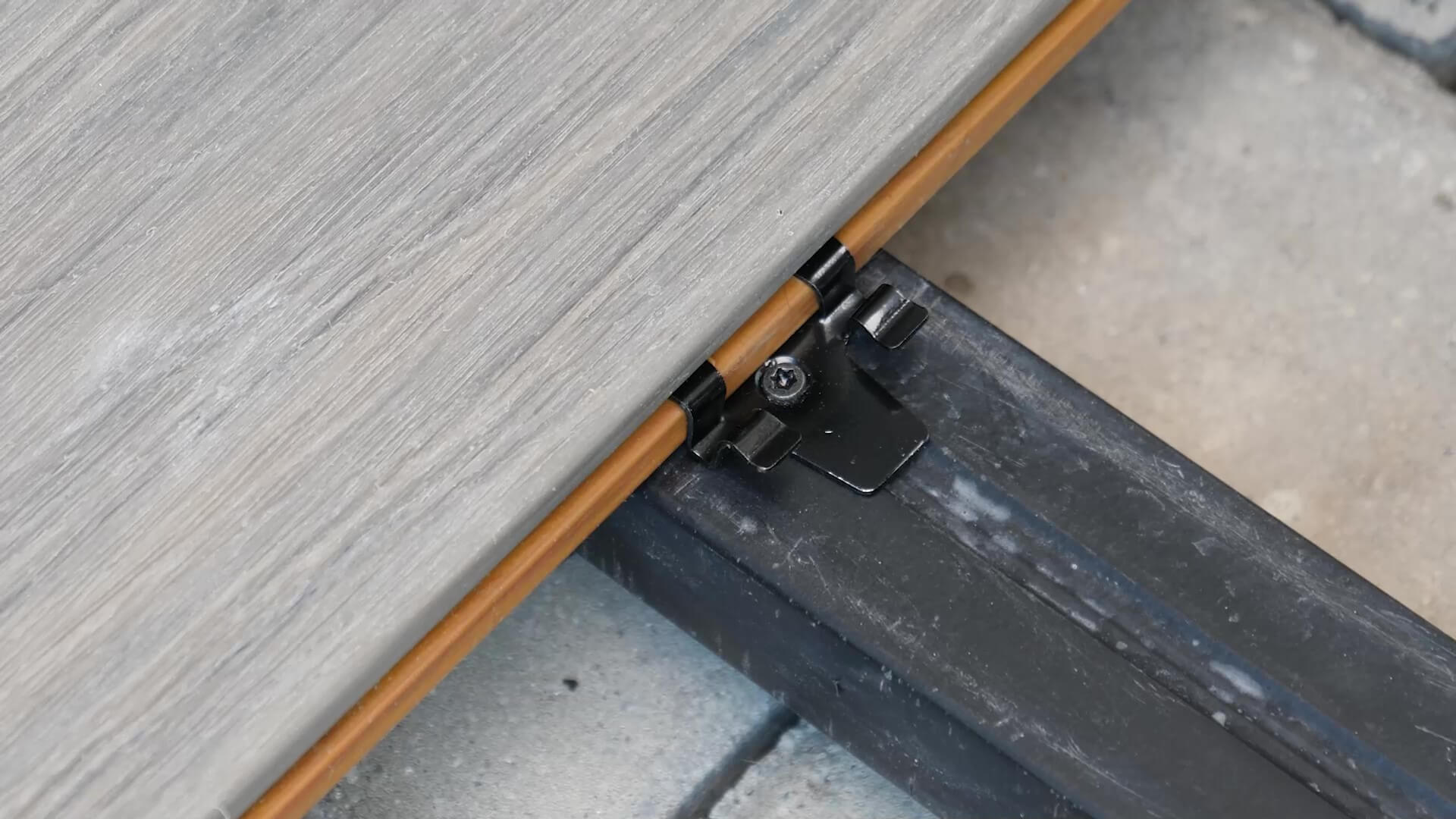 Befestigen Sie den Startclip am Rand des Balkens und schieben Sie dann die Terrassendiele in diesen Clip, sodass sie fest anliegt. Setzen Sie Montageclips in die speziellen Schlitze ein, die die Dielen verbinden, aber unsichtbar bleiben. Nur die Clips werden an den Balken geschraubt.