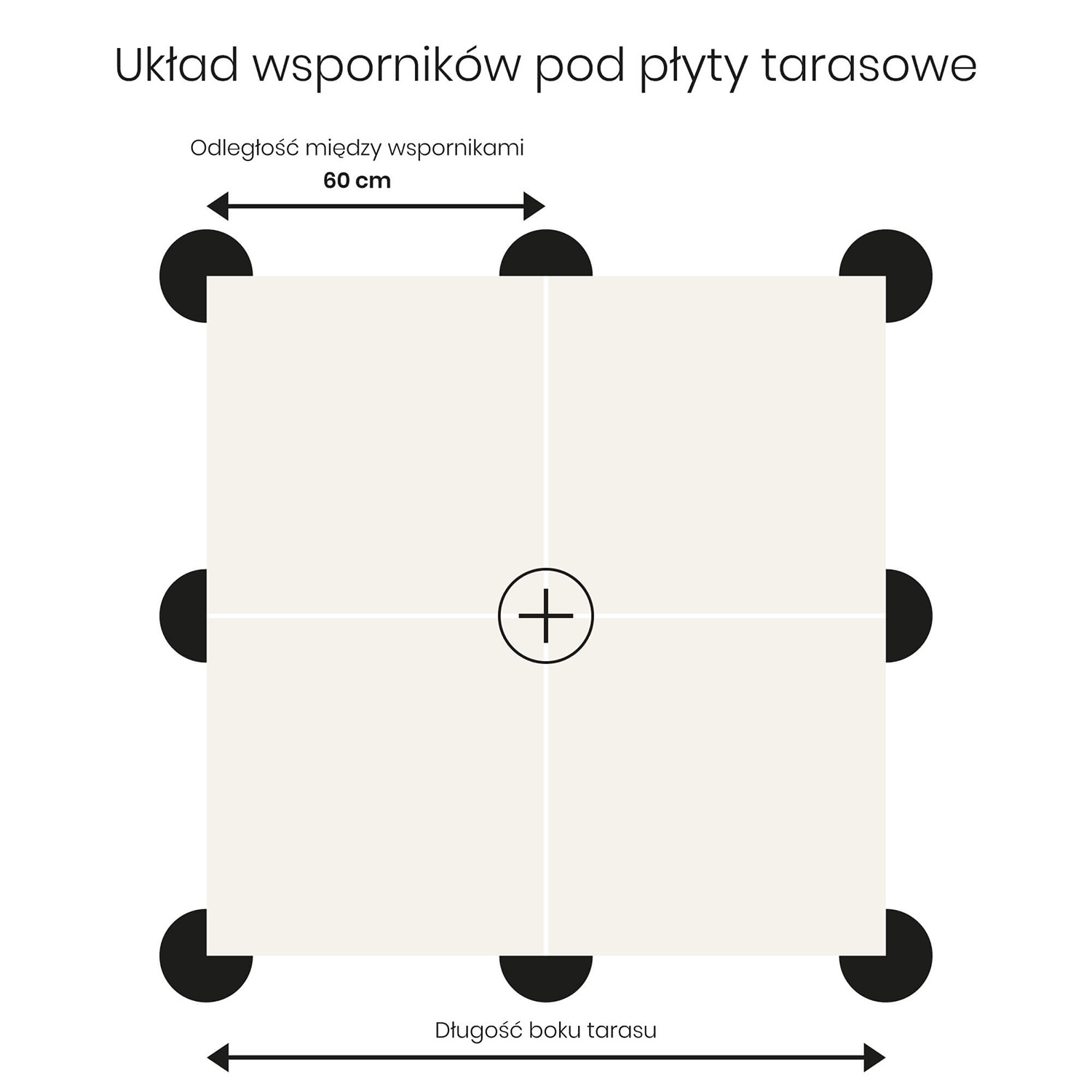 Płyty tarasowe w naszej ofercie mają wymiary 60 x 60 cm. Przy tej wielkości producent rekomenduje podparcie w 4 miejscach (w każdym rogu). W związku z tym odległość między wspornikami wynosić powinna 60 cm.