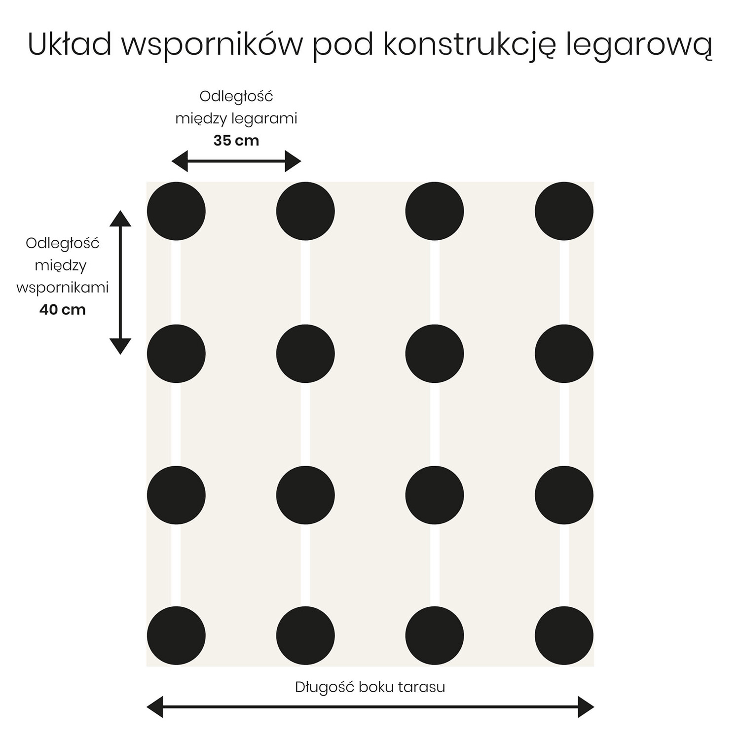 Odstępy między legarami powinny wynosić maksymalnie 35 cm, licząc od ich środka. Legary muszą być podparte w co najmniej 3 miejscach. Odległość między wspornikami powinna wynosić nie więcej niż 40 cm.