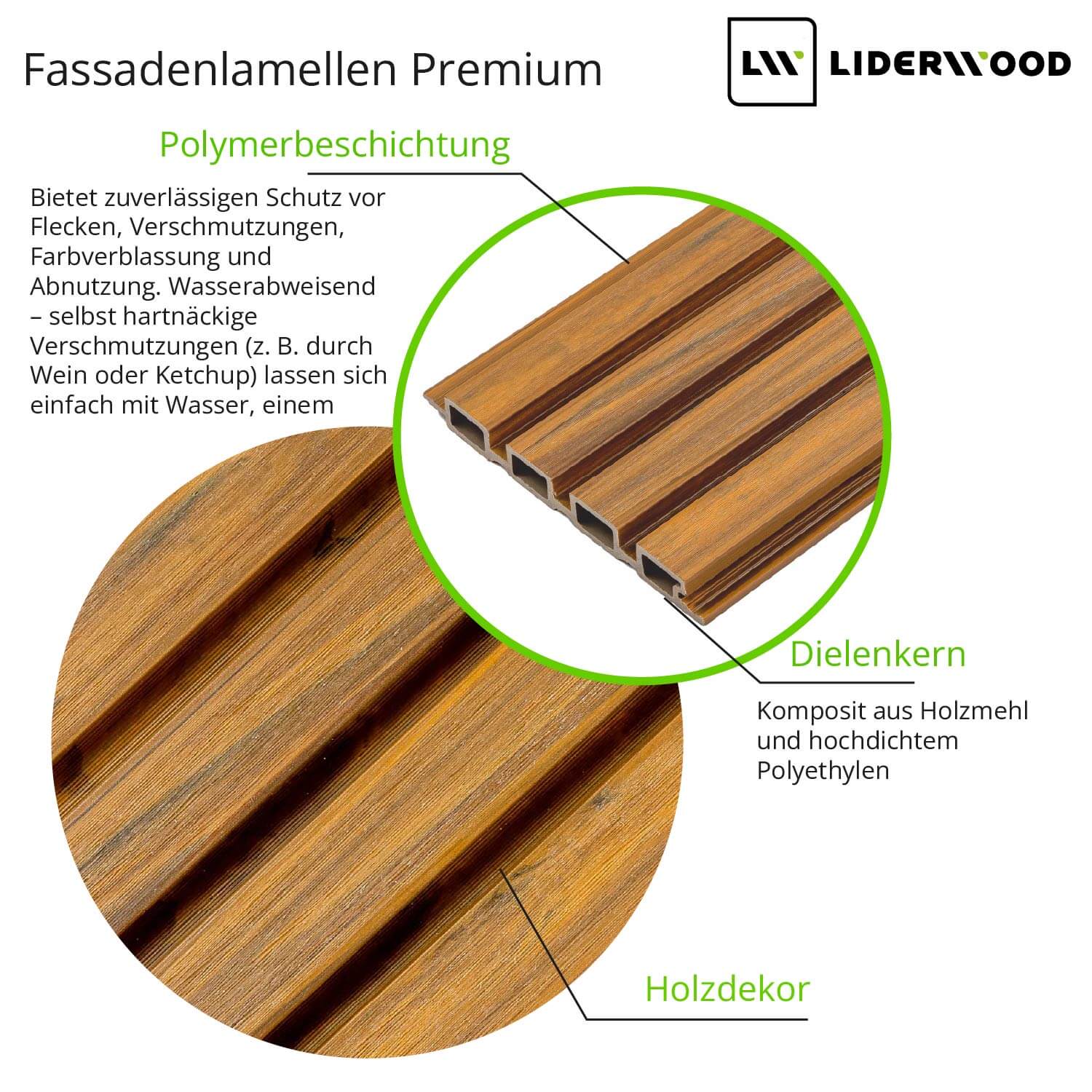 Die Lamellen bestehen aus einem widerstandsfähigen Verbundwerkstoff aus Holzmehl und hochdichtem Polyethylen, und ihre Oberfläche ist mit einer Polymerbeschichtung geschützt – einer Schutzschicht, die vor Abrieb, Flecken und Farbverblassung schützt. Die Paneele sind leicht zu reinigen und benötigen keine Wartung oder Ölung.