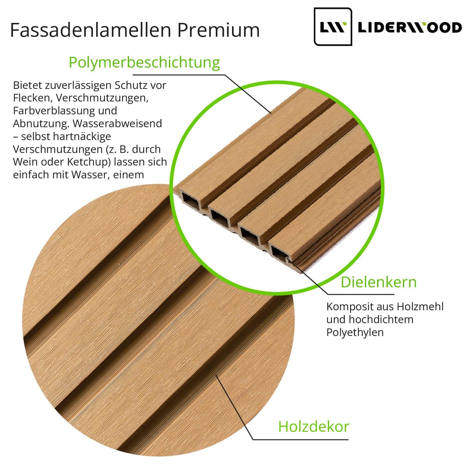 Die Lamellen bestehen aus einem widerstandsfähigen Verbundwerkstoff aus Holzmehl und hochdichtem Polyethylen, und ihre Oberfläche ist mit einer Polymerbeschichtung geschützt – einer Schutzschicht, die vor Abrieb, Flecken und Farbverblassung schützt. Die Paneele sind leicht zu reinigen und benötigen keine Wartung oder Ölung.