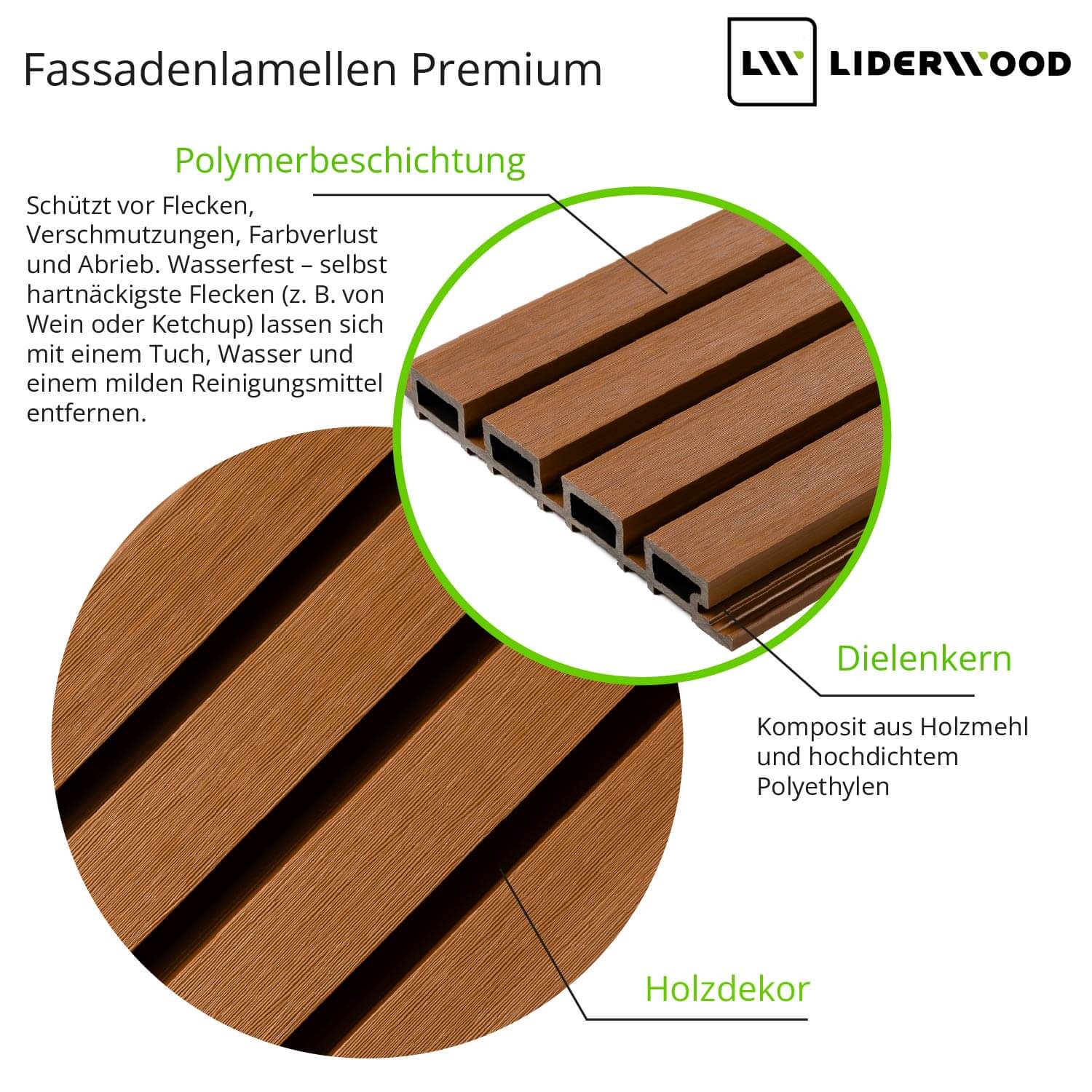 Die Lamellen bestehen aus einem widerstandsfähigen Verbundwerkstoff aus Holzmehl und hochdichtem Polyethylen, und ihre Oberfläche ist mit einer Polymerbeschichtung geschützt – einer Schutzschicht, die vor Abrieb, Flecken und Farbverblassung schützt. Die Paneele sind leicht zu reinigen und benötigen keine Wartung oder Ölung.