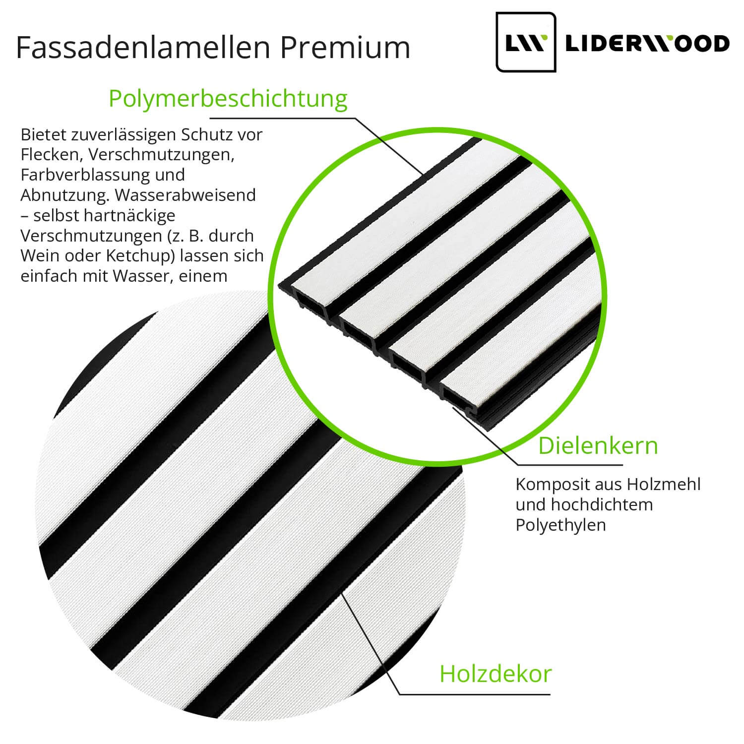 Die Lamellen bestehen aus einem widerstandsfähigen Verbundwerkstoff aus Holzmehl und hochdichtem Polyethylen, und ihre Oberfläche ist mit einer Polymerbeschichtung geschützt – einer Schutzschicht, die vor Abrieb, Flecken und Farbverblassung schützt. Die Paneele sind leicht zu reinigen und benötigen keine Wartung oder Ölung.