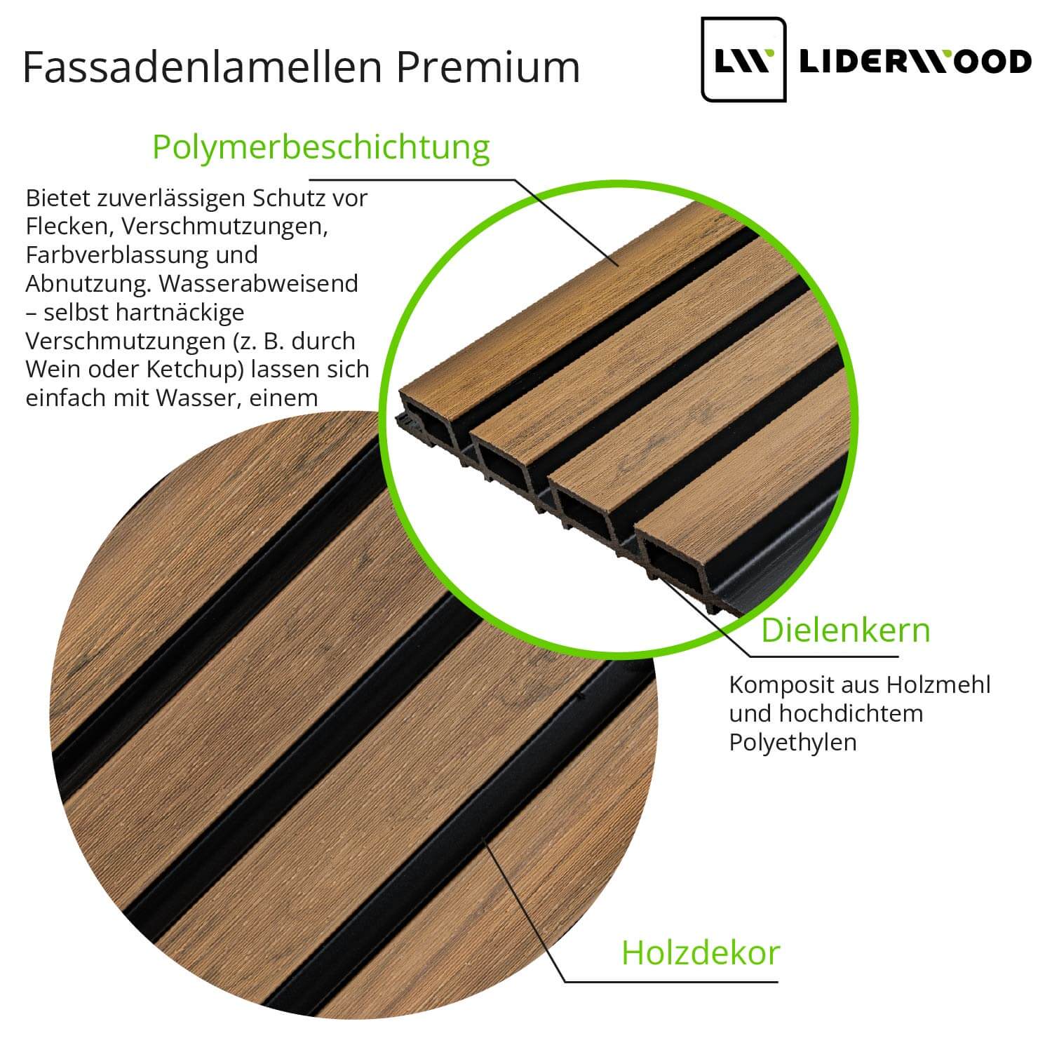 Die Lamellen bestehen aus einem widerstandsfähigen Verbundwerkstoff aus Holzmehl und hochdichtem Polyethylen, und ihre Oberfläche ist mit einer Polymerbeschichtung geschützt – einer Schutzschicht, die vor Abrieb, Flecken und Farbverblassung schützt. Die Paneele sind leicht zu reinigen und benötigen keine Wartung oder Ölung.