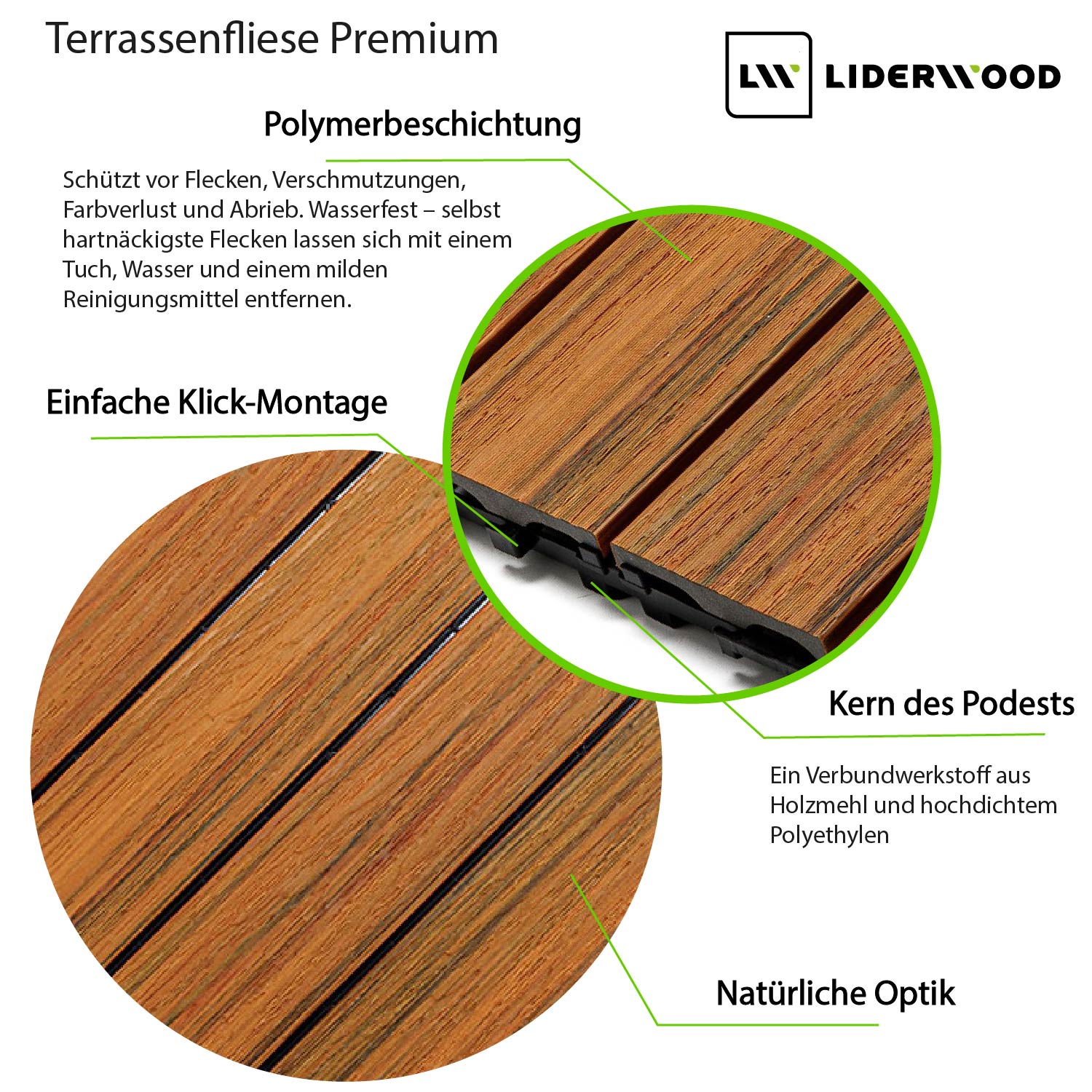 Premium WPC Terrassenfliese zeichnen sich durch eine außergewöhnlich hohe Verarbeitungsqualität aus. Sie überzeugen nicht nur durch ihre natürliche Holzoptik, sondern auch durch ihre solide und langlebige Konstruktion. Die Oberfläche mit einer schützenden Polymerschicht schützt die Podeste vor Verschmutzungen, Flecken und Abrieb. Eine jährliche Imprägnierung ist nicht erforderlich – es genügt eine normale Pflege und das regelmäßige Sauberhalten.