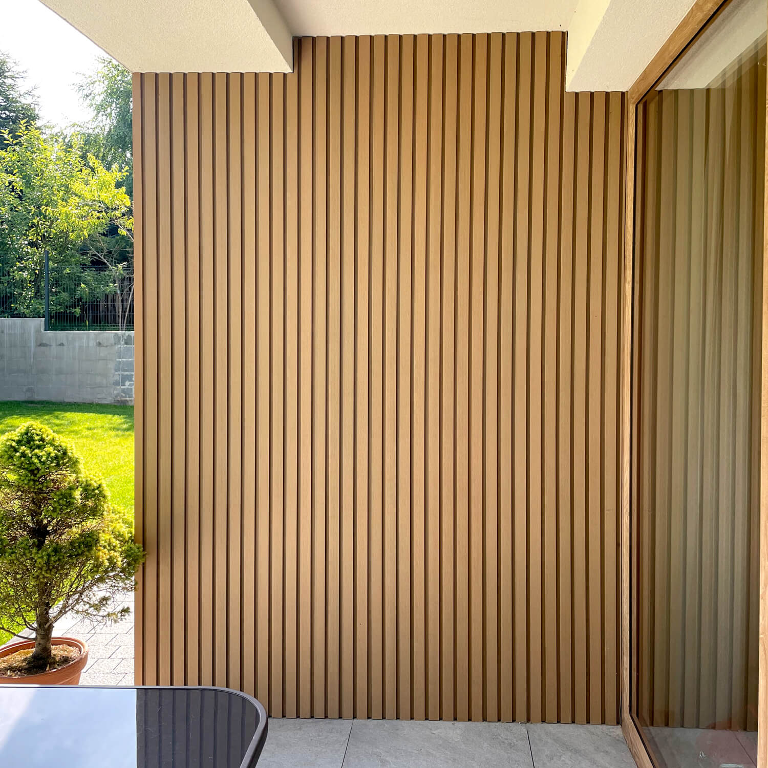 Premium WPC 4-fach Rhombusprofil ist das perfekte Material, um einer Fassade einen markanten Abschluss zu verleihen. Dank der innovativen Extrusionstechnologie und der verwendeten Polymerbeschichtung ist die Platte resistent gegen Flecken und Farbverluste. Ihre Witterungs-, Verrottungs-, Fäulnis- und Insektenbeständigkeit garantiert eine lange Nutzungsdauer, und die einfache Pflege sorgt dafür, dass die Fassade immer frisch aussieht.