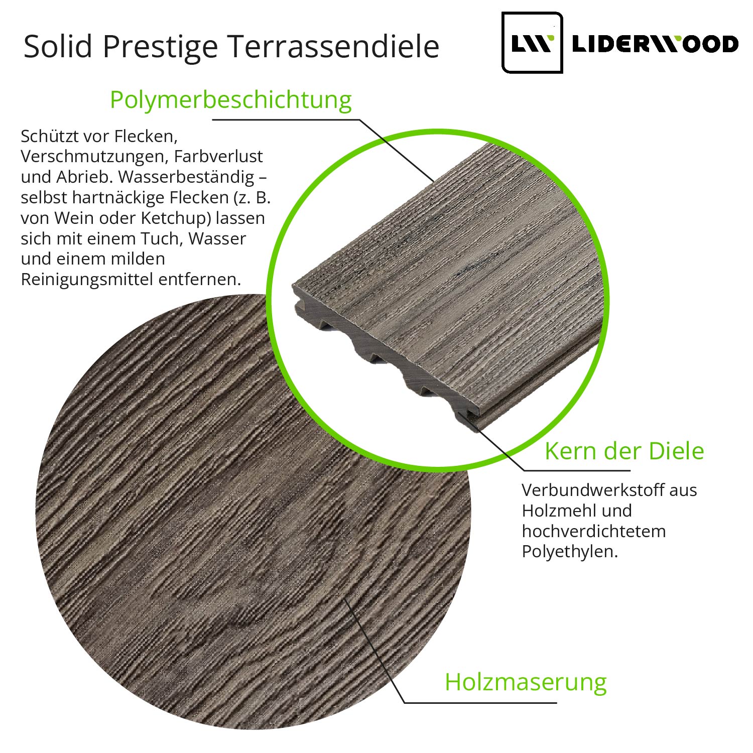 Die Solid Prestige Premium Kompositdiele ist die ideale Wahl für alle, die höchste Qualität erwarten und von einer Terrasse träumen, die Langlebigkeit mit einer außergewöhnlichen, natürlichen Optik verbindet. Sie eignet sich sowohl für elegante, moderne Räume als auch für klassische Gestaltungen.
